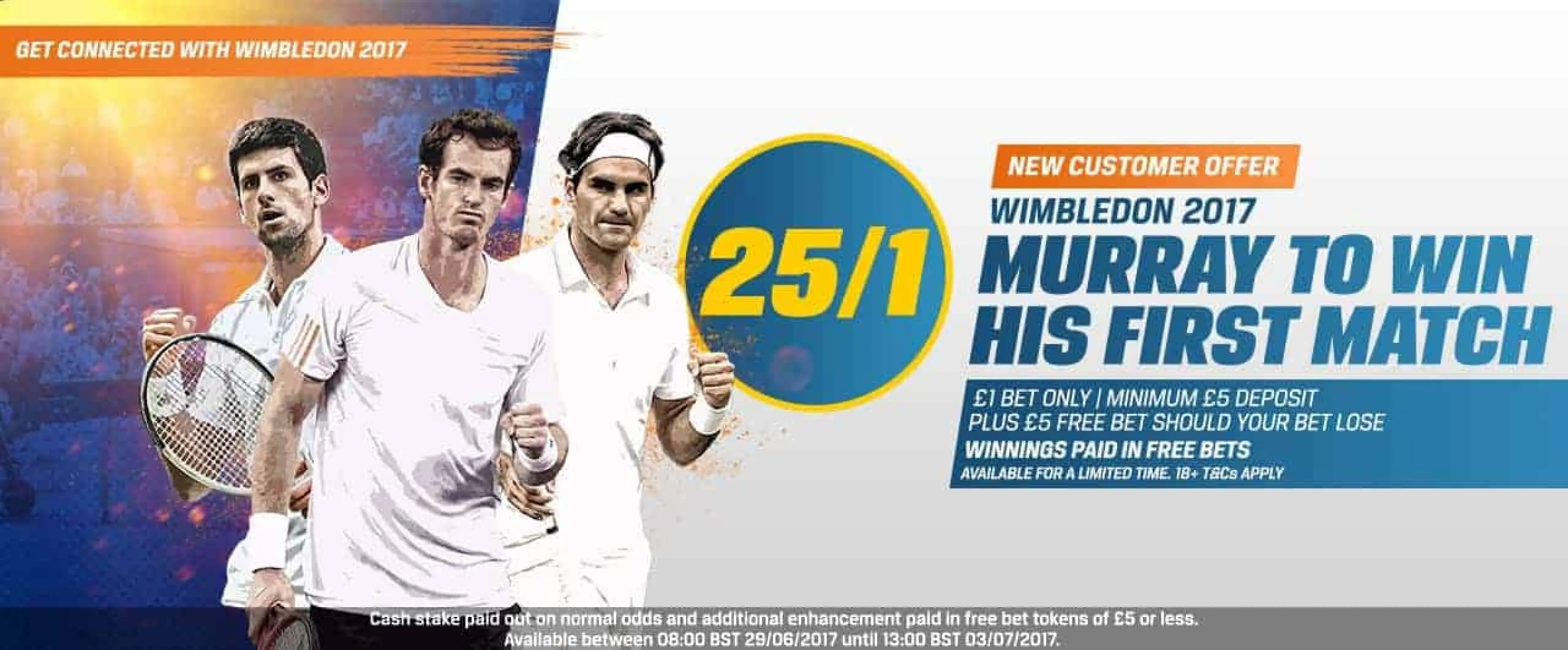 To take advantage of this brilliant offer, simply sign up for an online or mobile account with us, stake £/€1 on the enhanced odds (min. £/€5 deposit required), and if Andy Murray wins his opening match at Wimbledon 2017, you’ll receive your enhanced payout in free bets. It really is that simple. Full Terms and Conditions of this offer can be found at the bottom of this page.