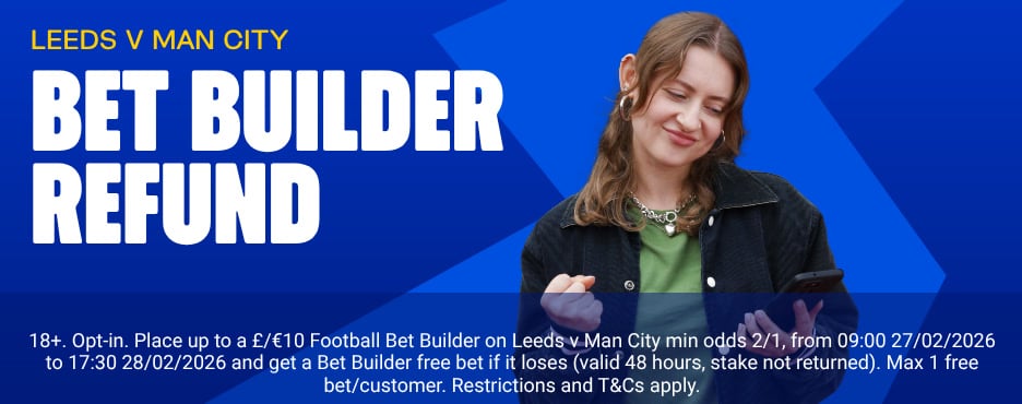 - Place a minimum £/€1 Bet Builder (minimum odds 2/1) on Leeds v Man City.