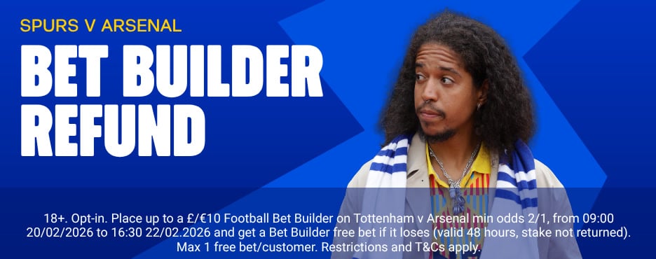- Place a minimum £/€1 Bet Builder (minimum odds 2/1) on Tottenham v Arsenal.