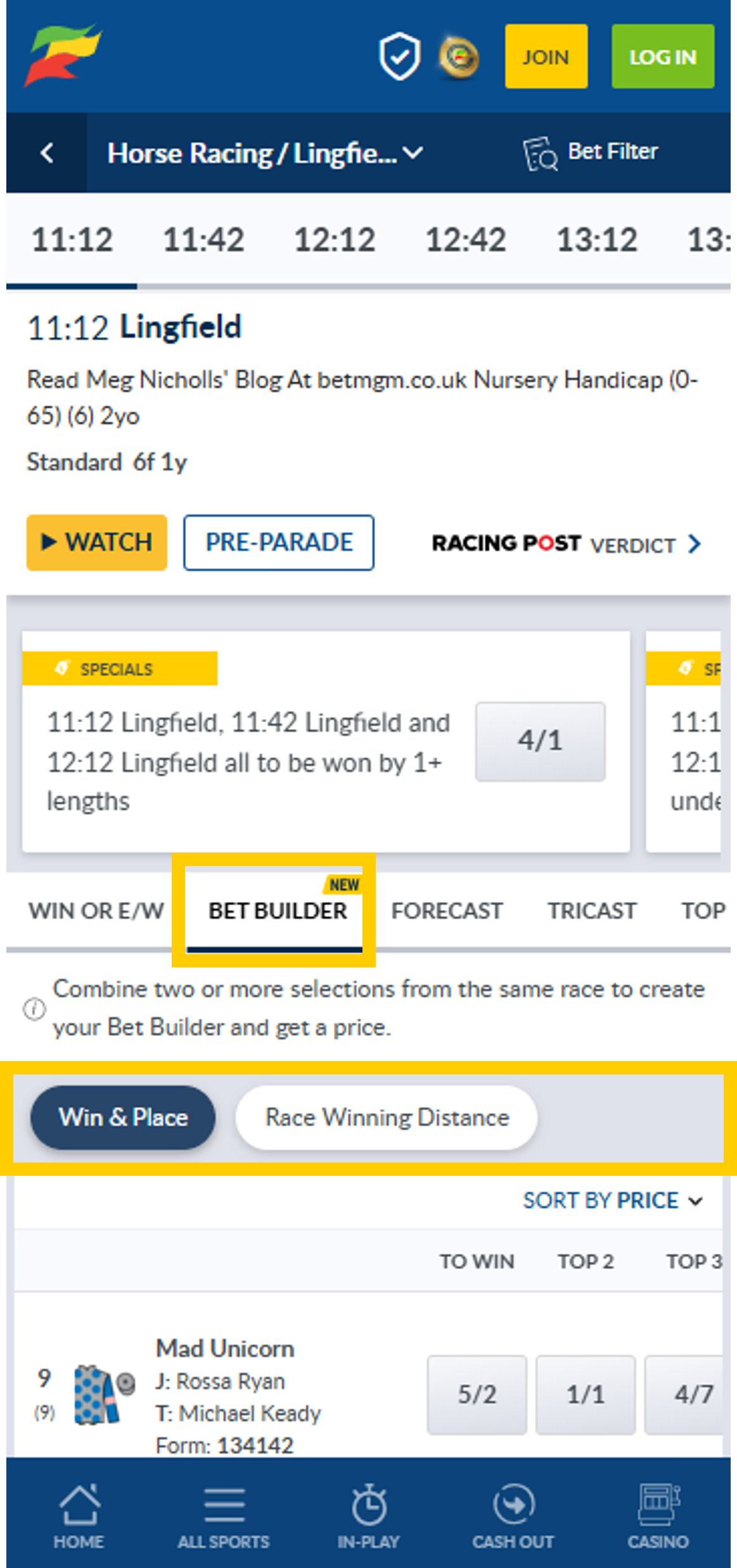 1. Click on the Bet Builder tab which appears when Coral Racing Bet Builder is available on a race |